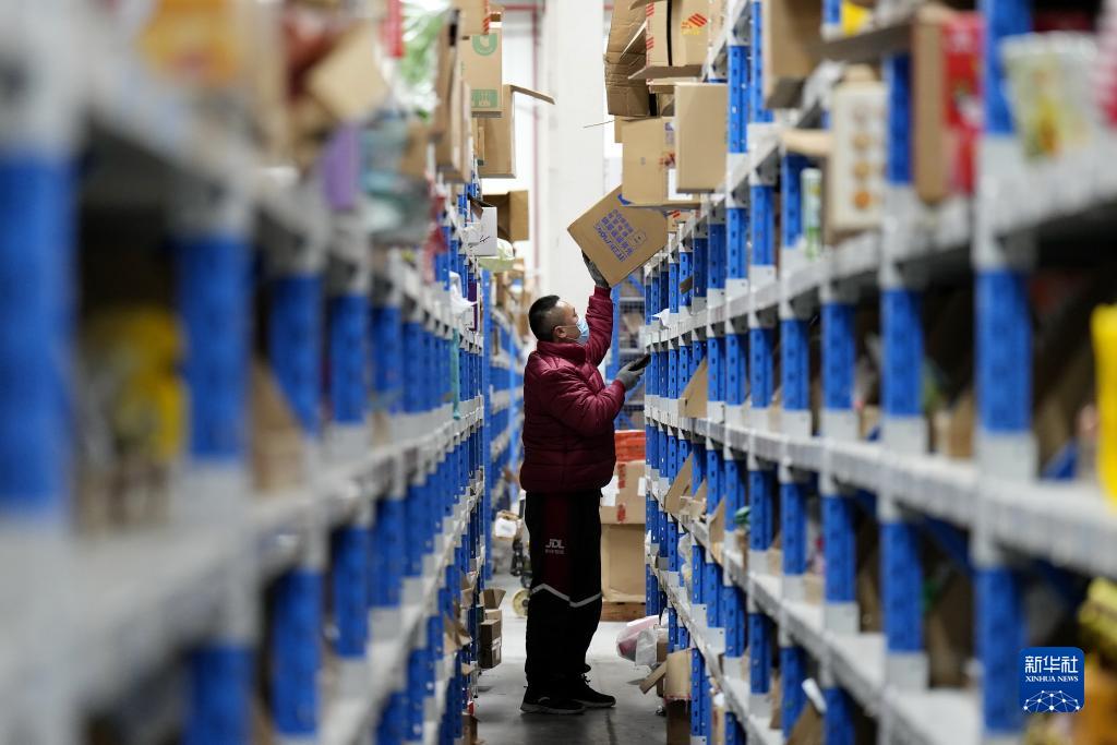 11月16日,在普洛斯唐山豐潤物流園,京東物流的工作人員在貨柜上查驗商品。