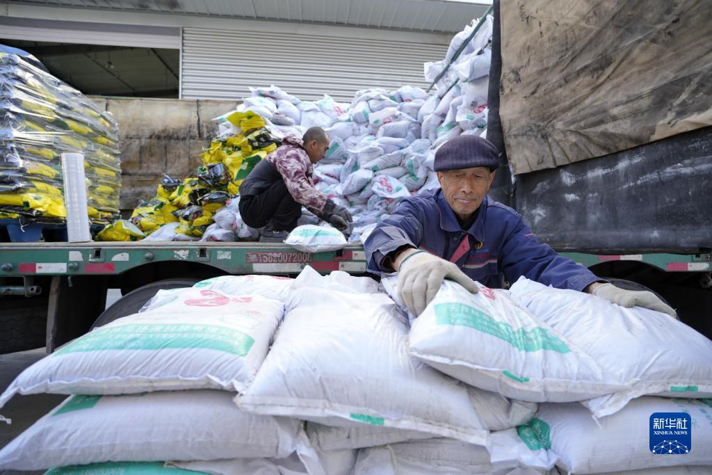 11月16日,在位于唐山市豐潤區的唐山公路港物流有限公司,工人在整理農資產品。