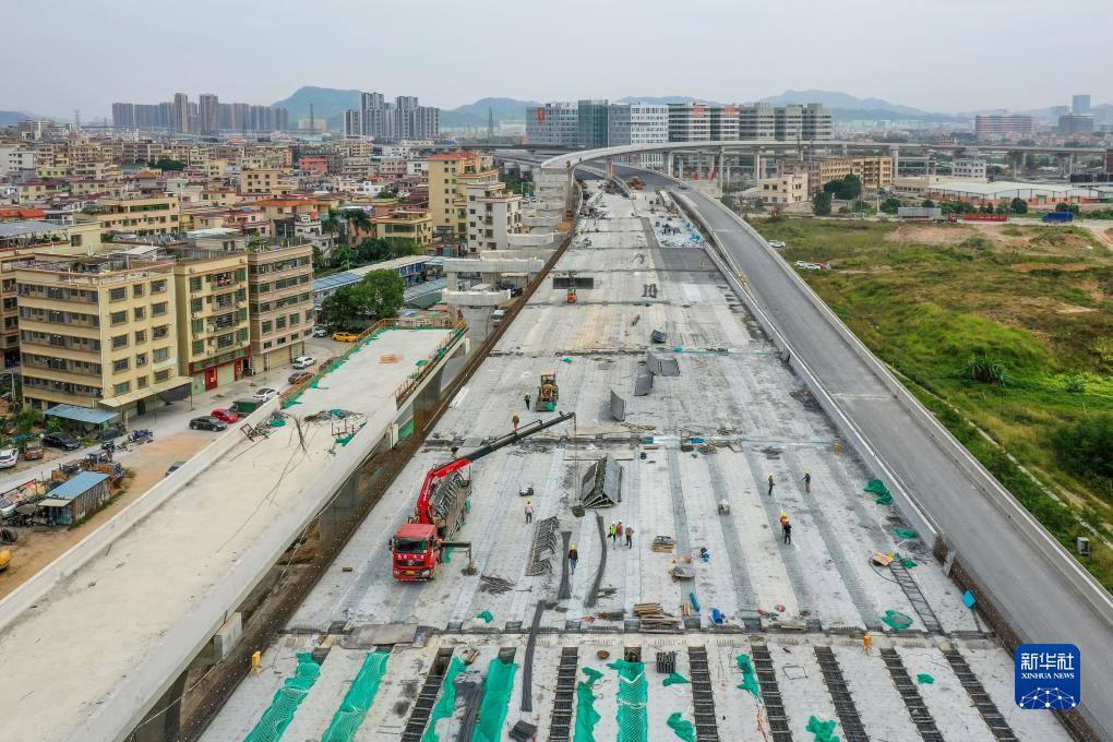 11月16日,建設者在中山坦神北路主線進行橋面系施工(無人機照片)。