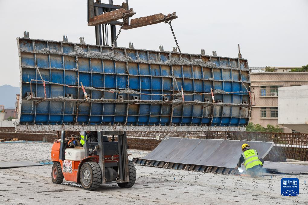 11月16日,建設者在中山坦神北路進行護欄模具吊裝作業。