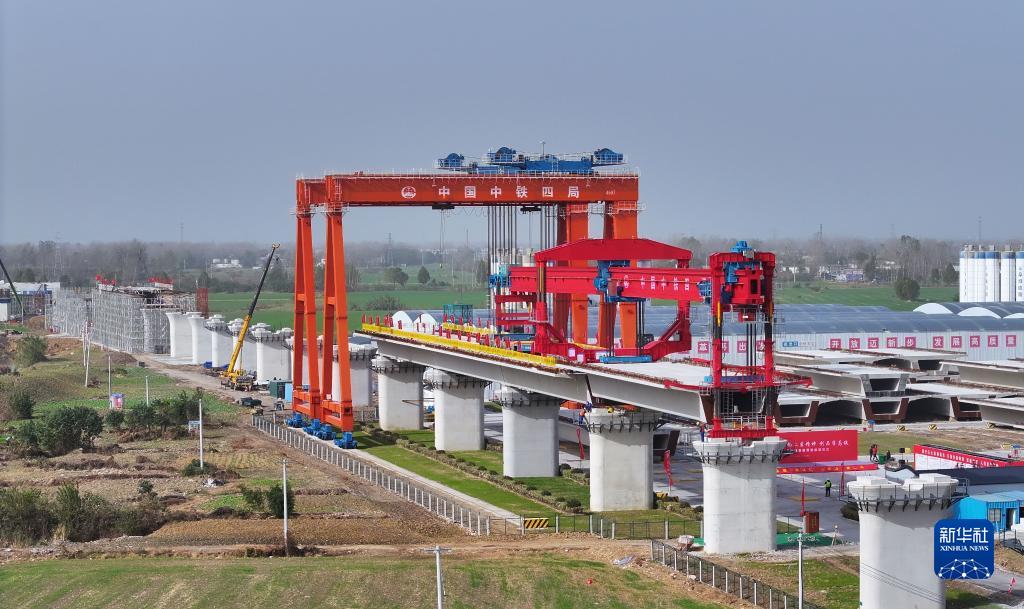 這是中鐵四局阜淮鐵路全線首榀箱梁架設現場(11月16日,無人機照片)。