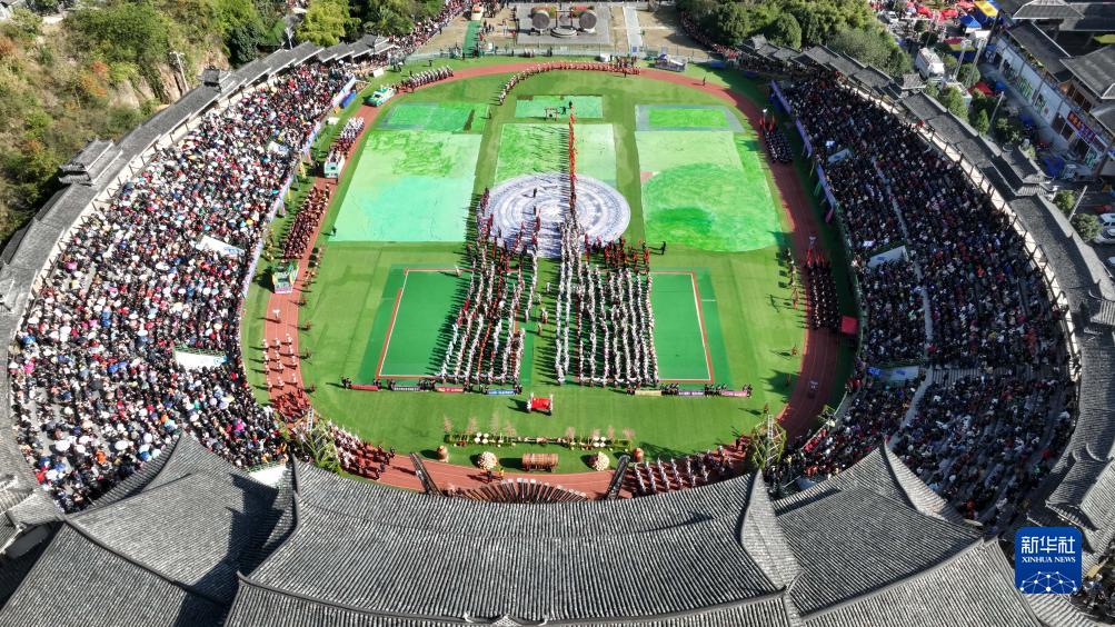 11月16日,在雷山縣民族文化活動中心,苗族同胞身著盛裝,載歌載舞歡慶苗年和鼓藏節(無人機照片)。