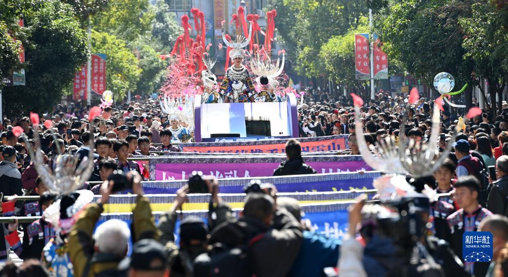 11月16日,在雷山縣縣城,苗族群眾身著盛裝,載歌載舞參加苗年和鼓藏節的巡游活動。