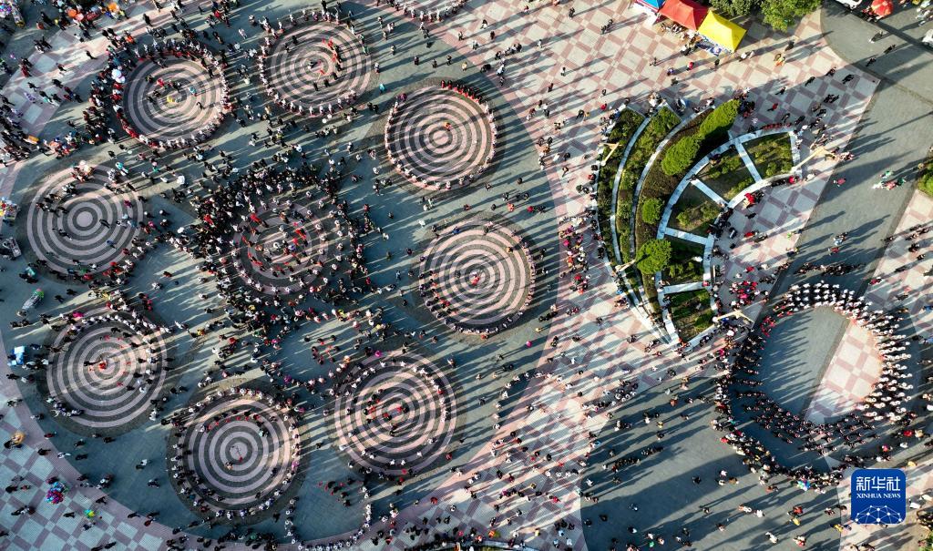 11月16日,在雷山縣民族文化活動中心,苗族同胞身著盛裝,載歌載舞歡慶苗年和鼓藏節(無人機照片)。