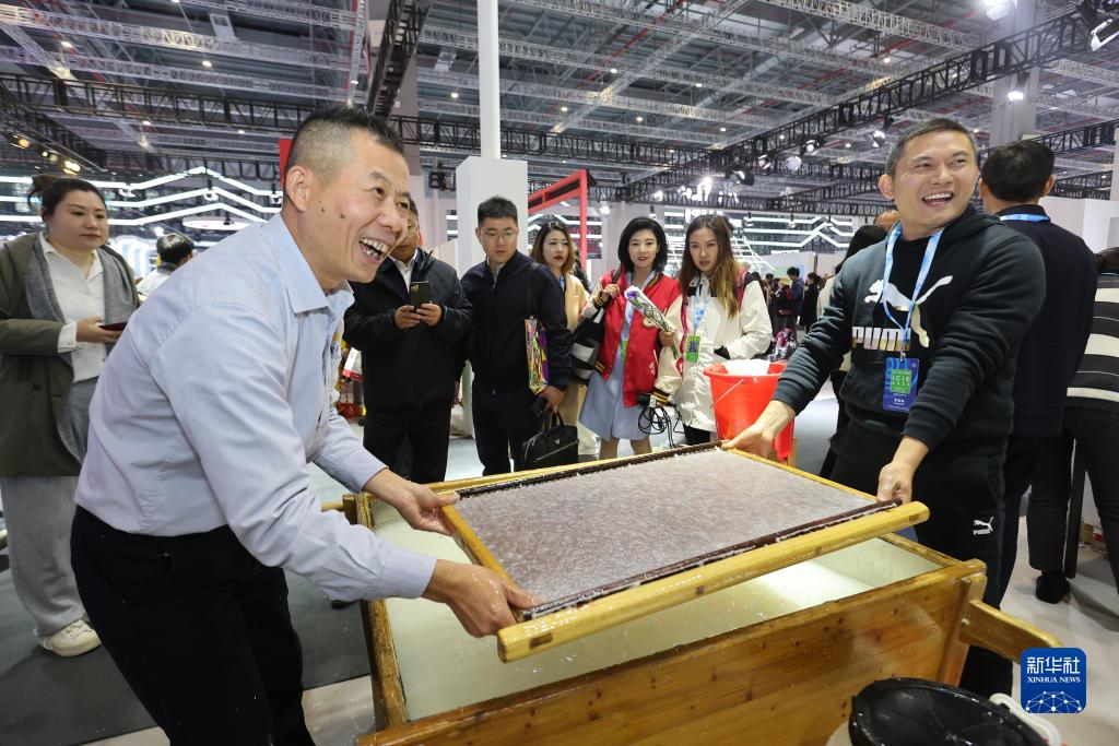 11月16日,在安徽展區,人們在師傅(左)的指導下現場體驗宣紙制作。