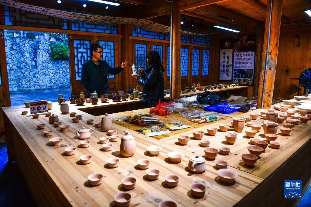 11月15日,幫扶干部在貴州省石阡縣國榮鄉樓上古寨的文創工坊里拍攝陶藝制品。