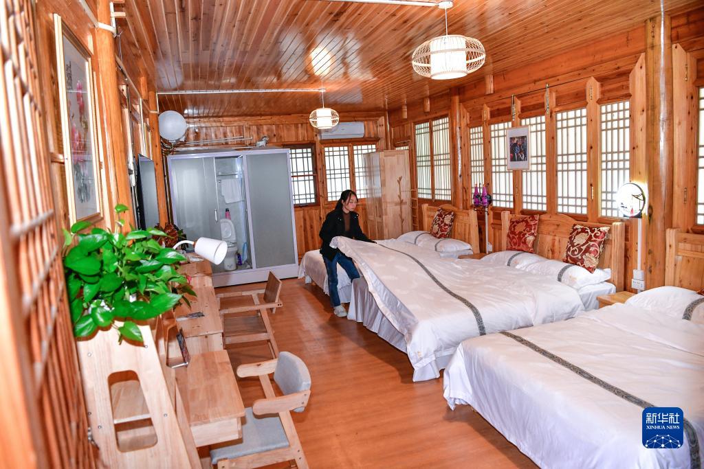 11月15日,貴州省石阡縣國榮鄉樓上村的村干部在整理民宿床鋪。