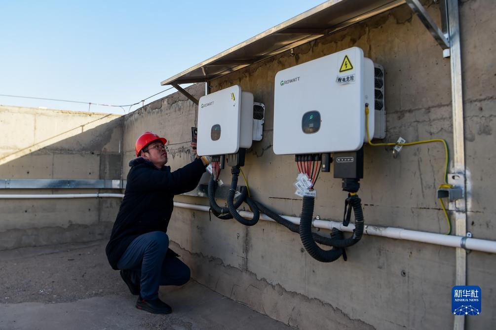 11月16日,工作人員在位于海勃灣區的烏海市第八中學餐廳屋頂檢查光伏設備。