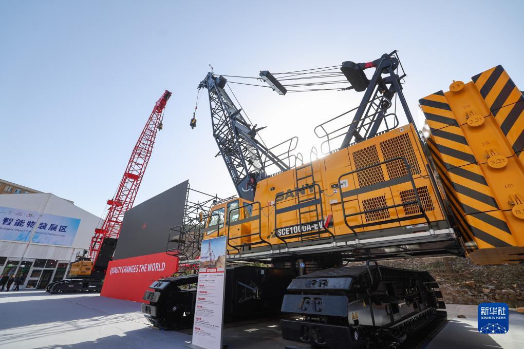 11月17日,這是數智物流裝備產業展上展示的吳興高新區三一集團首發的100噸級純電驅動履帶起重機。