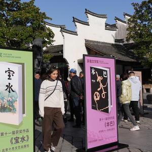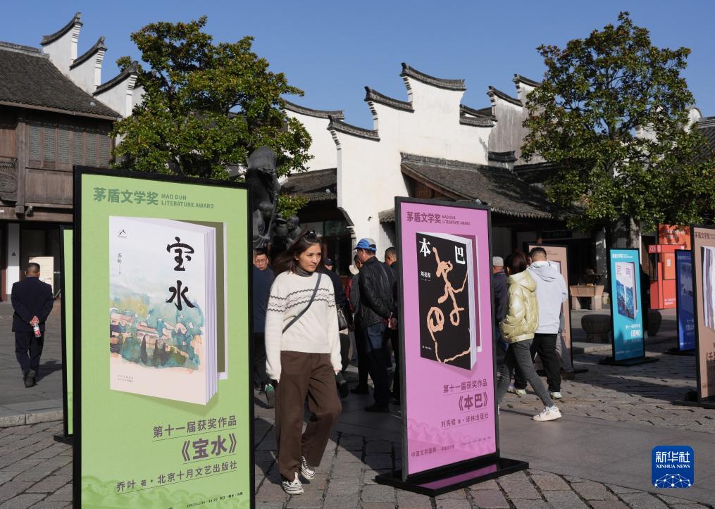 11月17日,人們從烏鎮景區展示的茅盾文學獎獲獎作品展板旁走過。