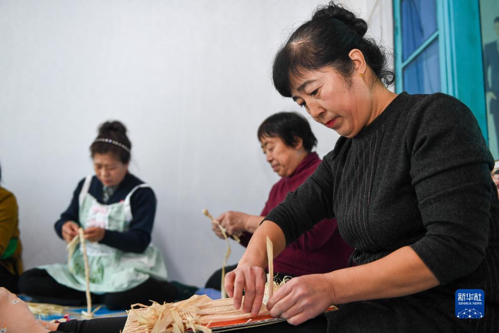 11月16日,在長春市九臺區龍嘉巧姐草編農民專業合作社,閆金鳳(右)帶領社員制作草編工藝品。