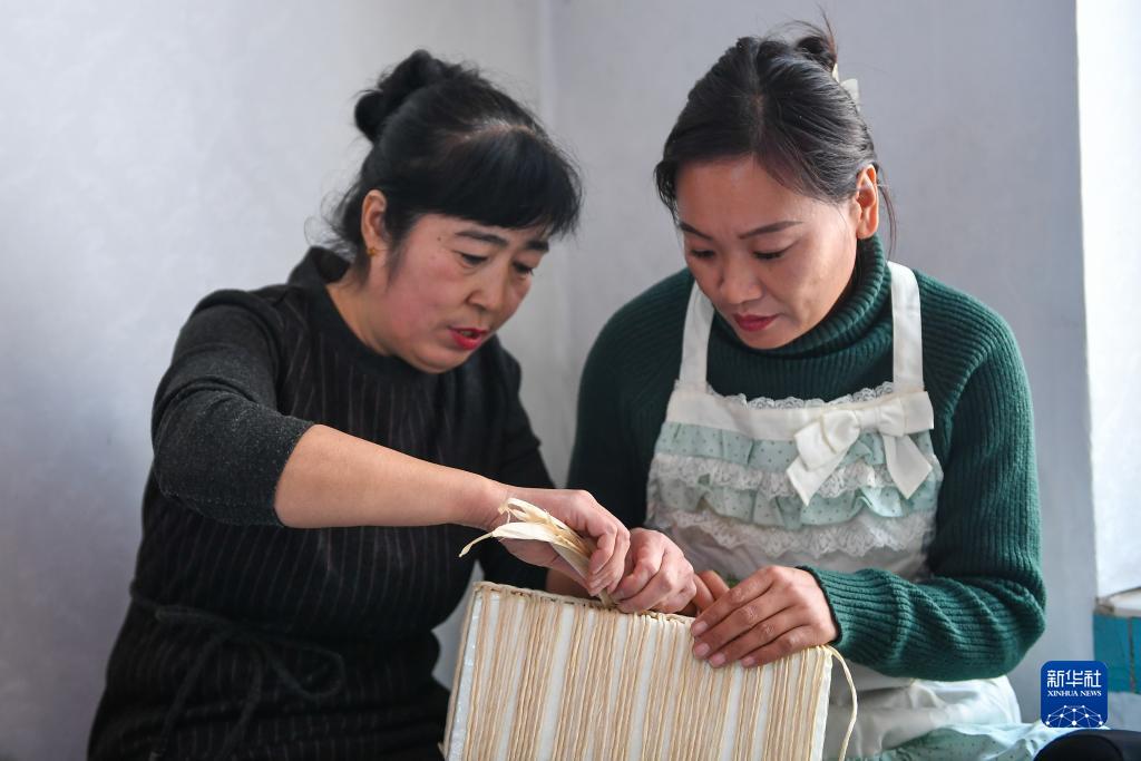 11月16日,在長春市九臺區龍嘉巧姐草編農民專業合作社,閆金鳳(左)帶領社員制作草編工藝品。