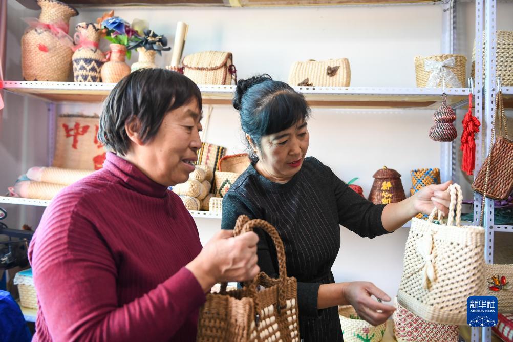 11月16日,在長春市九臺區龍嘉巧姐草編農民專業合作社,閆金鳳(右)向社員展示草編工藝品。