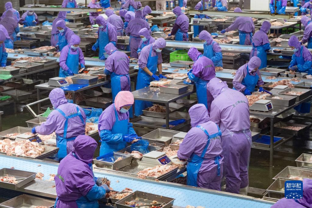 11月15日,在位于鶴崗市蘿北縣的黑龍江北三峽食品有限公司,工人在生產車間內加工雞肉。