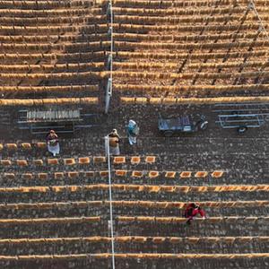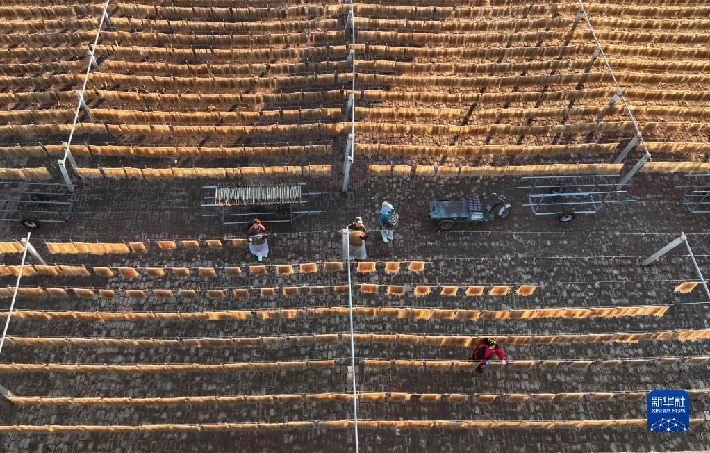 11月17日,河北省遵化市平安城鎮一家傳統手工粉條加工合作社的社員在晾曬粉條(無人機照片)。