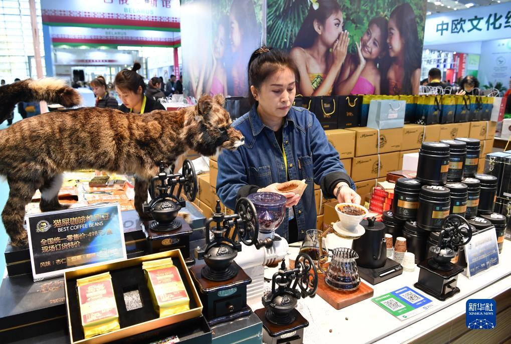11月16日,印度尼西亞展位工作人員為觀眾制作一款貓屎咖啡。
