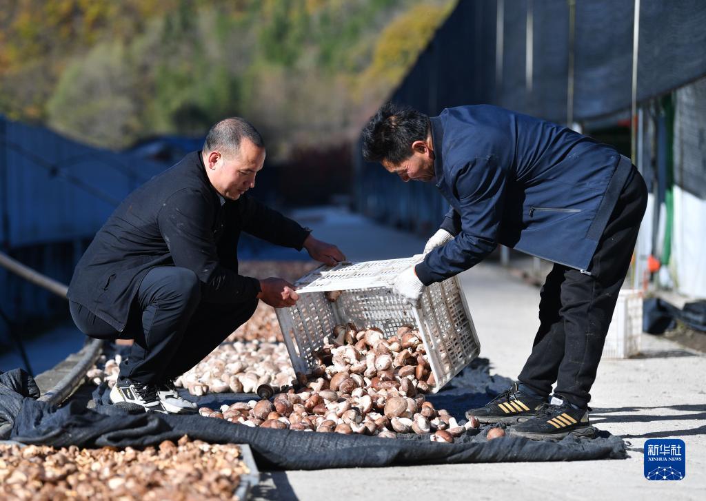 11月17日,農戶在寧陜縣城關鎮一處香菇種植園區晾曬香菇。