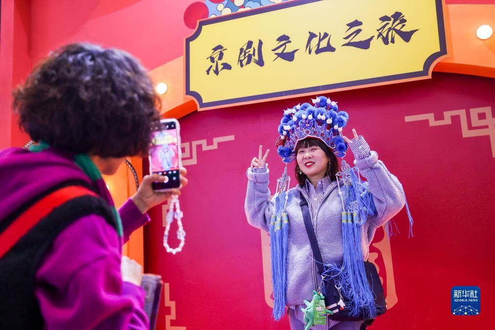 11月17日,參觀者在2023中國國際旅游交易會北京展區體驗佩戴京劇頭飾。