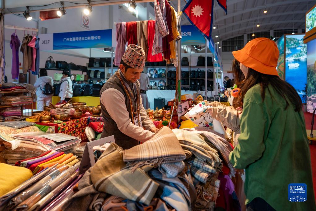 11月17日,一名來自尼泊爾的參展商(左)在2023中國國際旅游交易會上售賣圍巾。