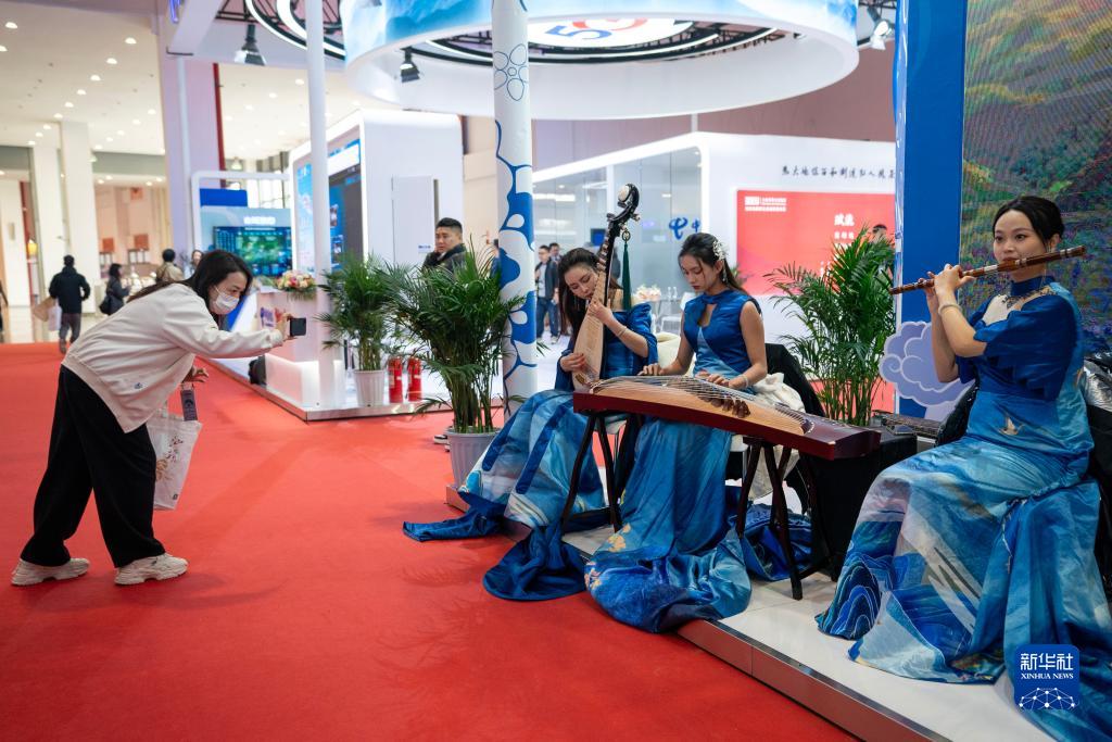 11月17日,演奏人員在2023中國國際旅游交易會上表演中國傳統樂器。