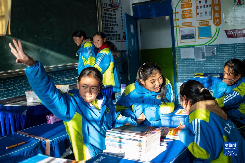 斯曲卓瑪(右三)和同學在課間休息(11月10日攝)。