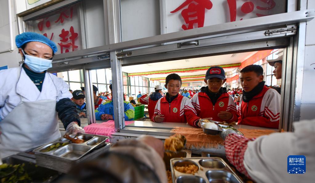 當雄縣中學的學生在學校食堂打午飯(11月10日攝)。