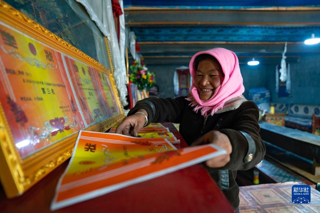 斯曲卓瑪的媽媽在整理孩子們的獎狀(11月9日攝)。