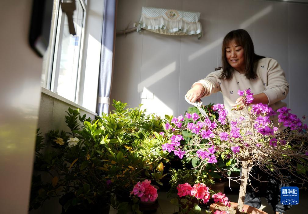 11月17日,河北省灤州市葛莊村一處“美麗庭院”示范戶的居民在打理種植的花卉。