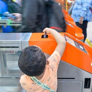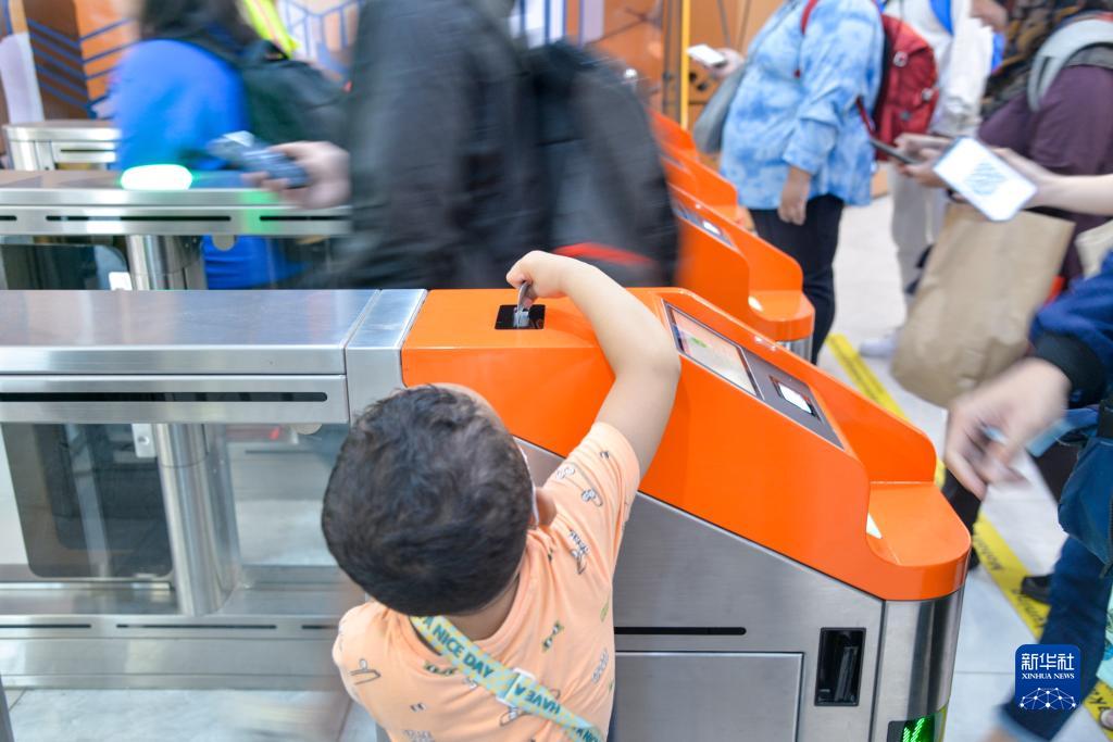 11月17日,在印度尼西亞雅加達的雅萬高鐵哈利姆站候車大廳,一名小朋友刷票前往站臺。