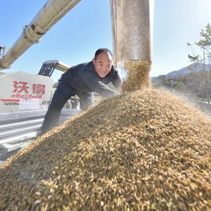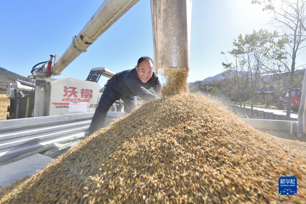 11月17日,在湖北省襄陽市??悼h歇馬鎮三坪村稻漁種養基地,村民整理收割機收割的晚稻。