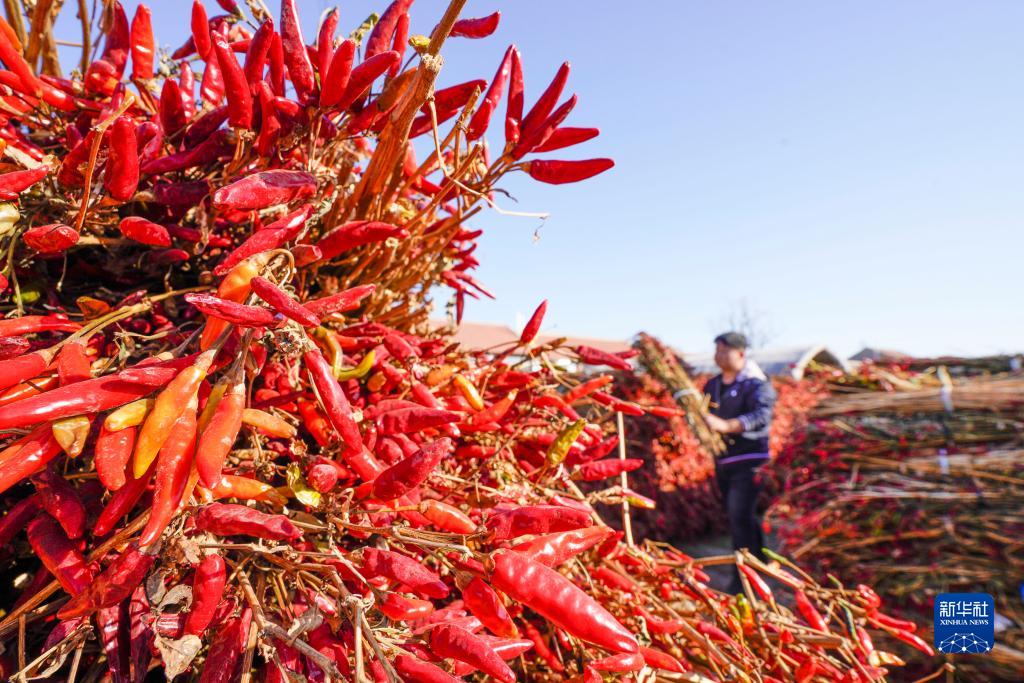 11月17日,農民在河北省唐山市玉田縣亮甲店鎮一家蔬菜專業合作社的場院搬運辣椒。