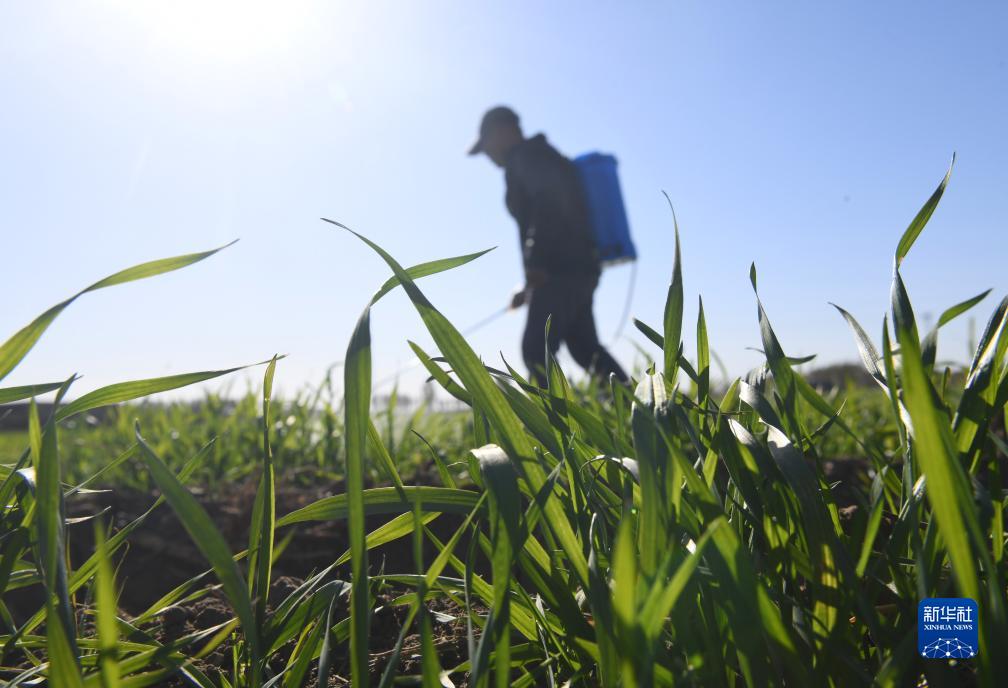 11月17日,河北省石家莊新樂市長壽街道辦事處東名村農民在田間管護冬小麥。