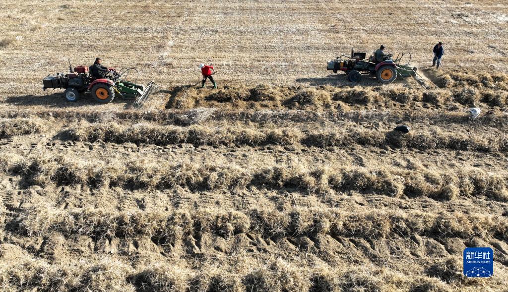 11月17日,在河北省石家莊市行唐縣獨羊崗鄉藥材種植基地,農戶駕駛農機采收白茅根(無人機照片)。