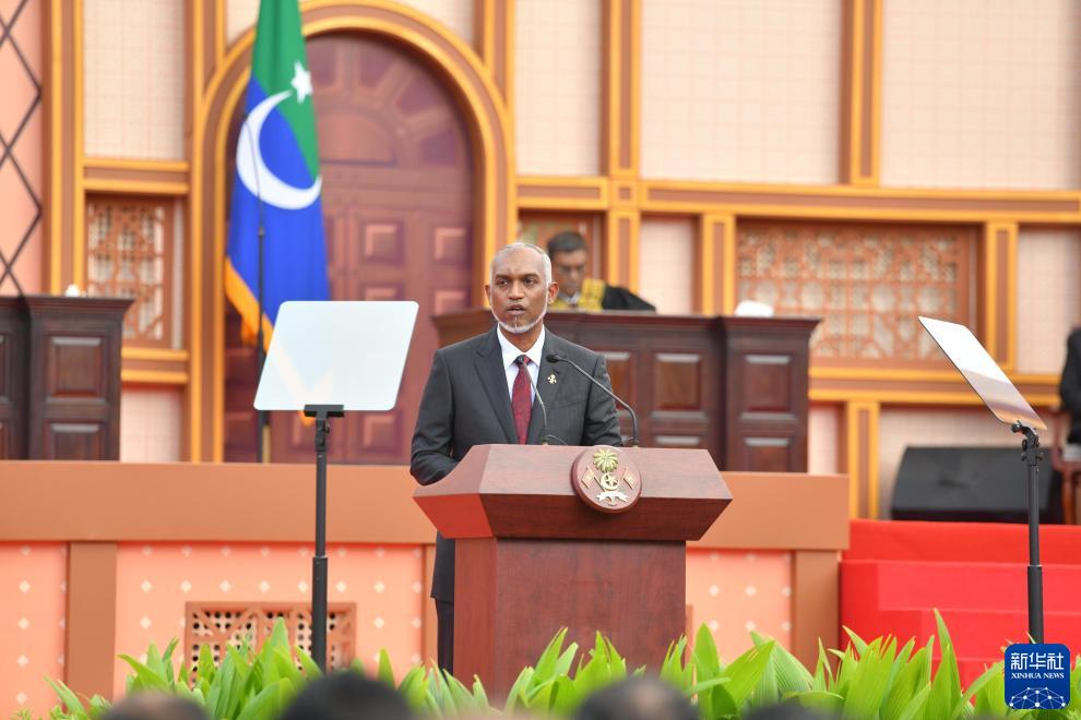 11月17日,馬爾代夫新任總統穆伊茲在首都馬累發表就職講話。