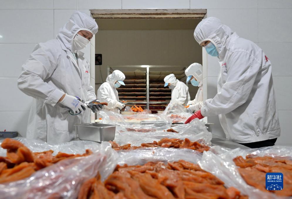 11月17日,河北省灤南縣安各莊鎮一家食品公司的工人在紅薯條分揀車間工作。