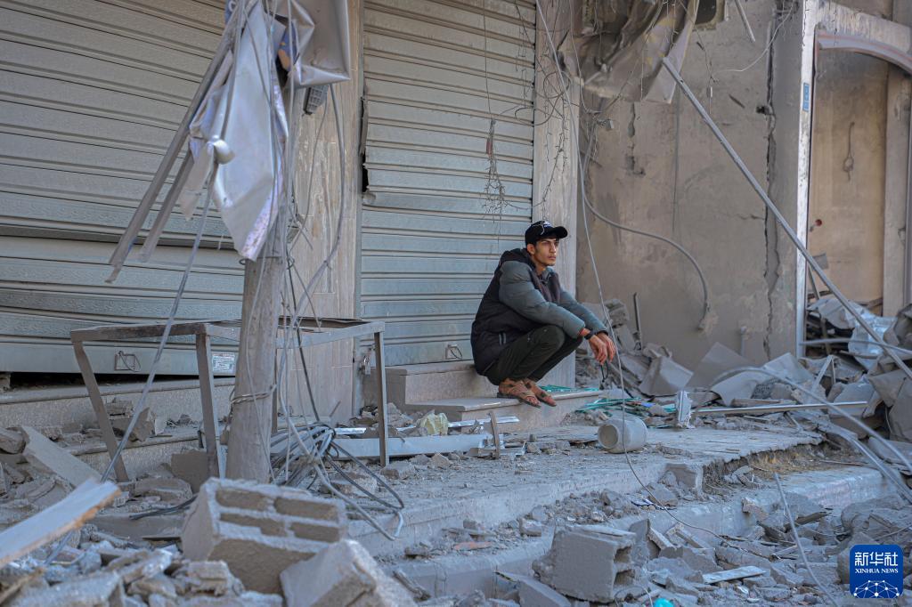 11月17日,在加沙地帶南部城市汗尤尼斯,一名男子蹲在遭以色列襲擊后的建筑廢墟旁。