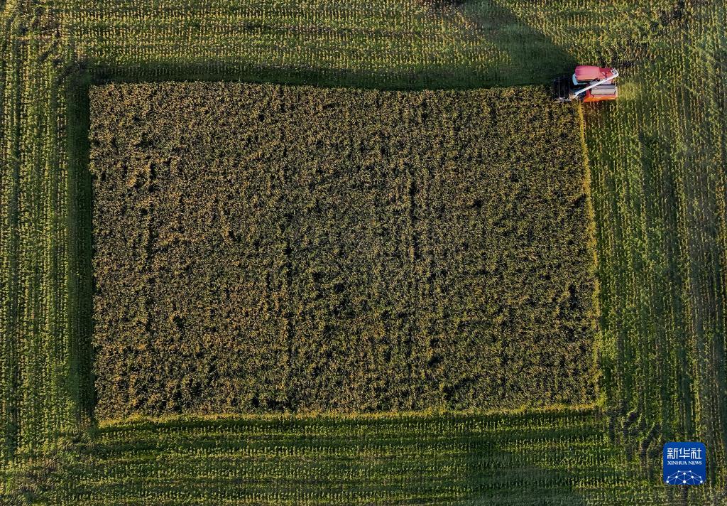 農機手駕駛收割機在稻田里收割水稻(11月17日攝,無人機照片)。