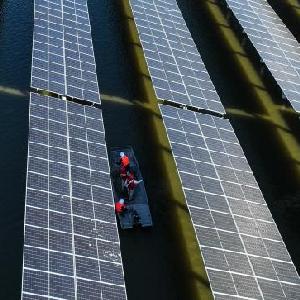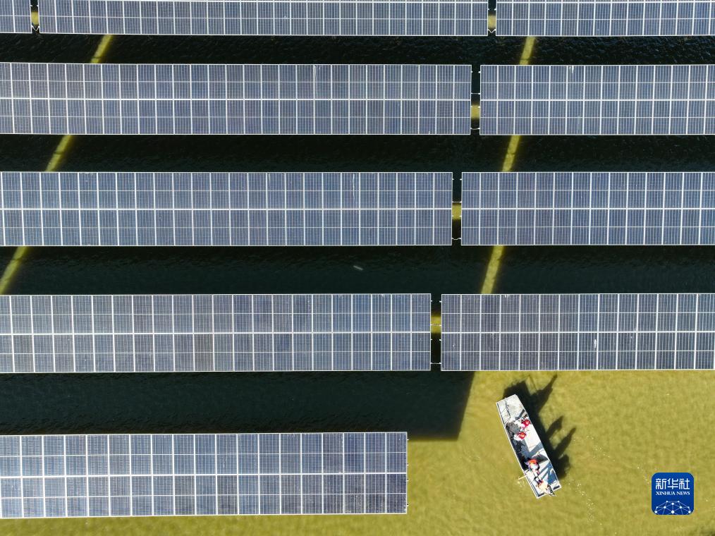 11月17日,在連云港市灌云縣圩豐鎮洋橋村,國網連云港供電公司員工對漁光互補發電項目進行巡檢(無人機照片)。