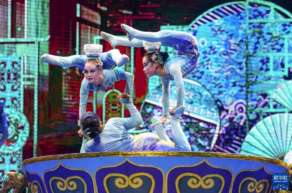 這是四川省遂寧市雜技團帶來的雜技《景泰藍的遐想——頂碗》(11月17日攝)。
