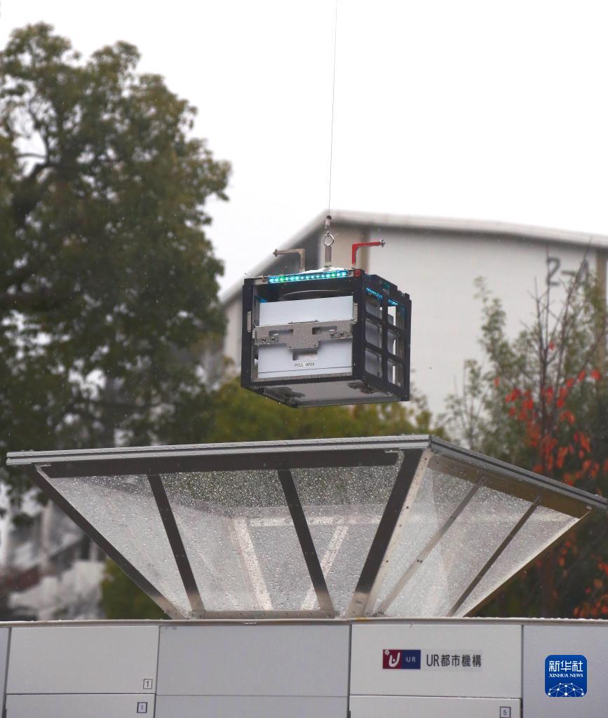 11月17日,在日本川崎市,空中索道機器人在面向媒體的試驗說明會上演示將商品放入取貨柜。