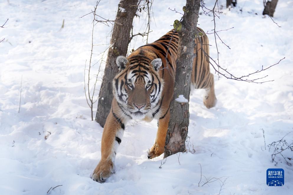 冰城哈爾濱市近日迎來數次降雪天氣,在黑龍江東北虎林園,散放區的東北虎在雪地活動。