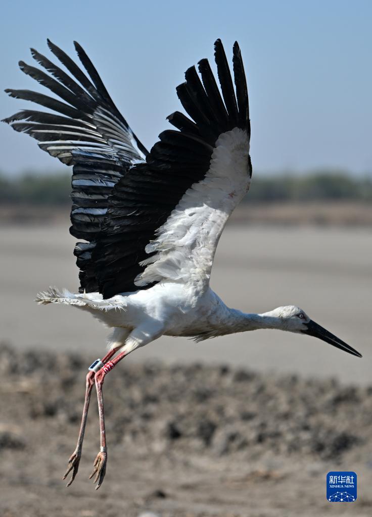 11月18日,一只東方白鸛振翅起飛。