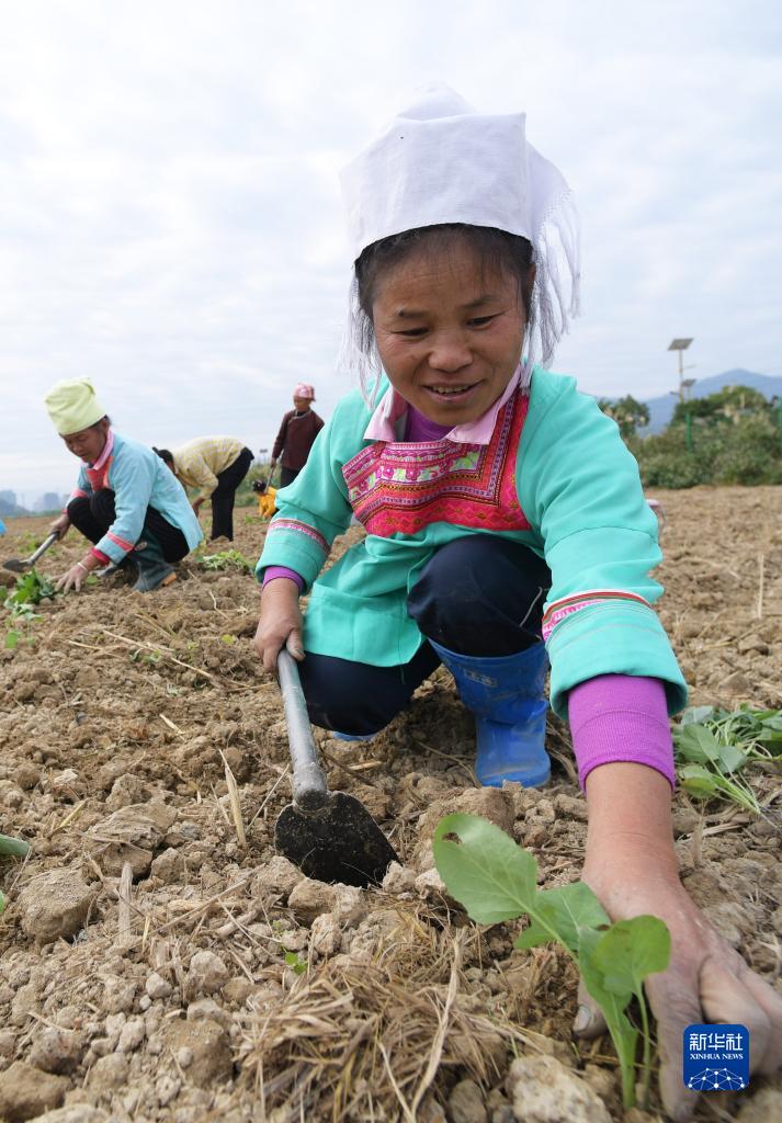 11月18日,村民在貴州省黔東南苗族侗族自治州榕江縣車江萬畝大壩移栽油菜苗。