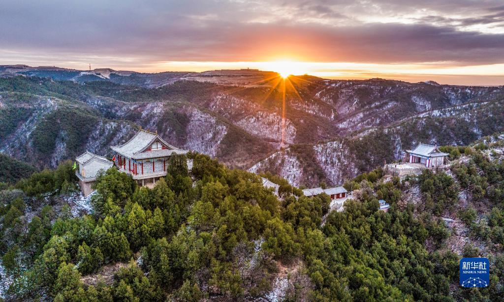 11月13日,陜西省延安市志丹縣九吾山森林公園在朝陽的照射下,蒼翠森林披上金光,宛如一幅壯麗的畫卷。