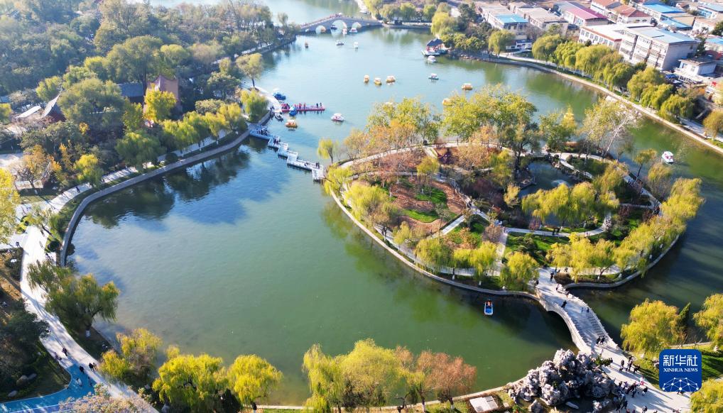 這是11月18日在山東省滕州市荊河公園拍攝的冬景(無人機照片)。