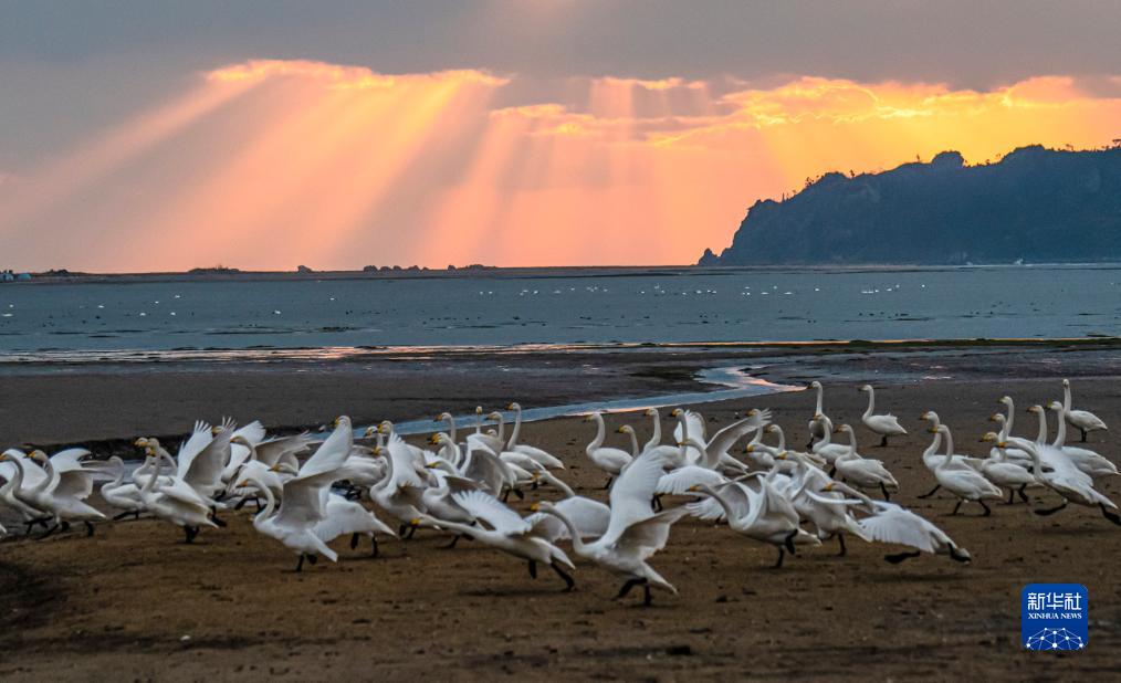11月18日,在山東省榮成大天鵝國家級自然保護區天鵝湖湖畔,一群大天鵝在覓食。