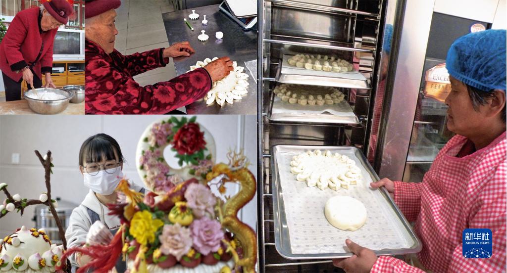 這是一張拼版照片。左上、左中為田曉的姥姥在制作面花(受訪者提供);右為田曉的媽媽在蒸制面花(受訪者提供);左下為田曉在制作“祝壽花饃”(11月12日,新華社記者李欣攝)。