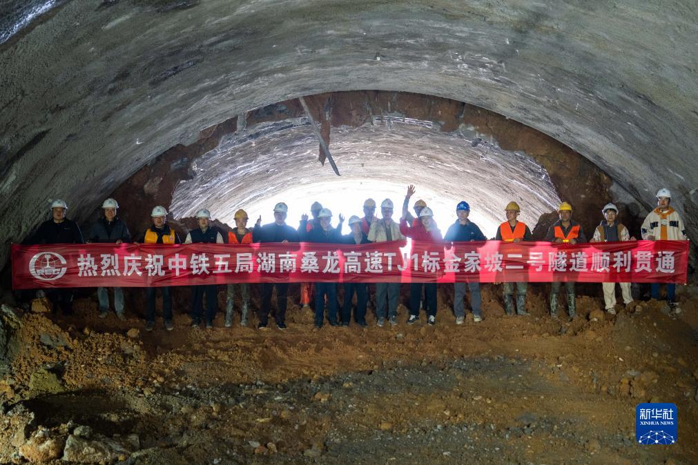 11月19日,中鐵五局施工人員在慶祝桑龍高速金家坡二號隧道貫通。