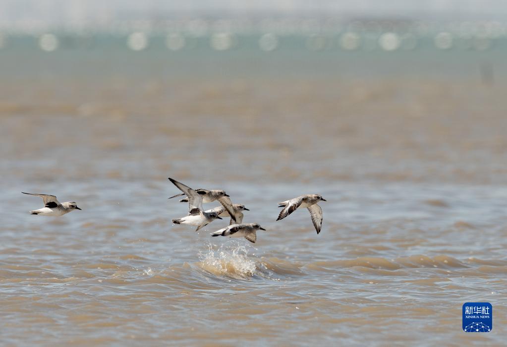 一群水鳥掠過泉州灣河口濕地海面上空(11月18日攝)。