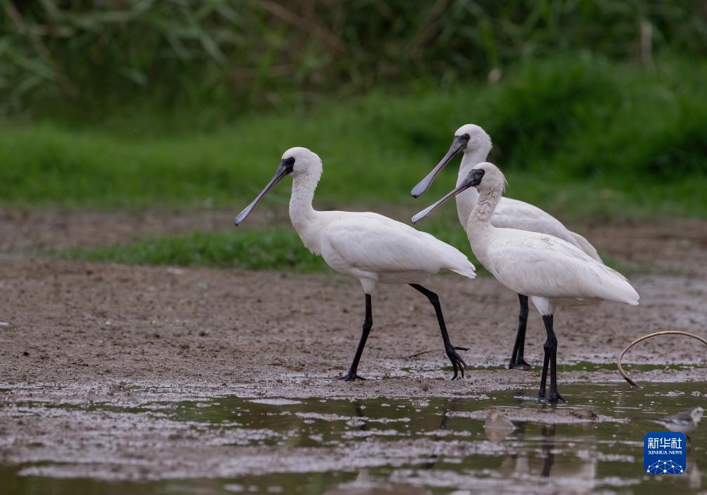 三只國家一級重點保護野生動物黑臉琵鷺在福州長樂閩江河口濕地停歇(11月15日攝)。